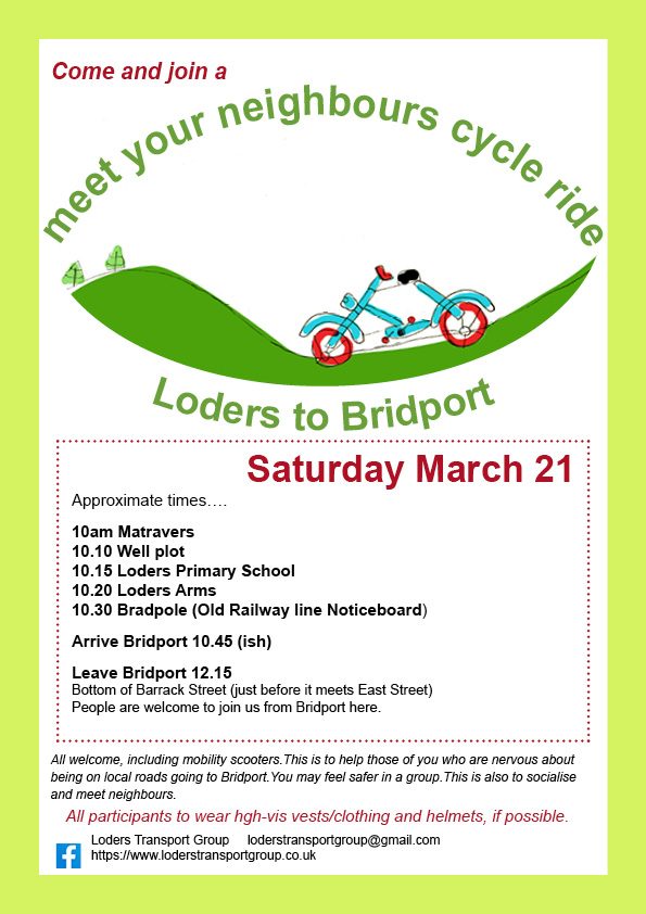 Come along for our March “Meet Your Neighbours” community cycle ride — a relaxed outing suitable for all ages and abilities. Whether you’re an experienced cyclist or just getting started, you’ll find a friendly group, a gentle pace, and a warm welcome. It’s ideal for families, beginners, or anyone who would like to join an easy-going ride into Bridport.